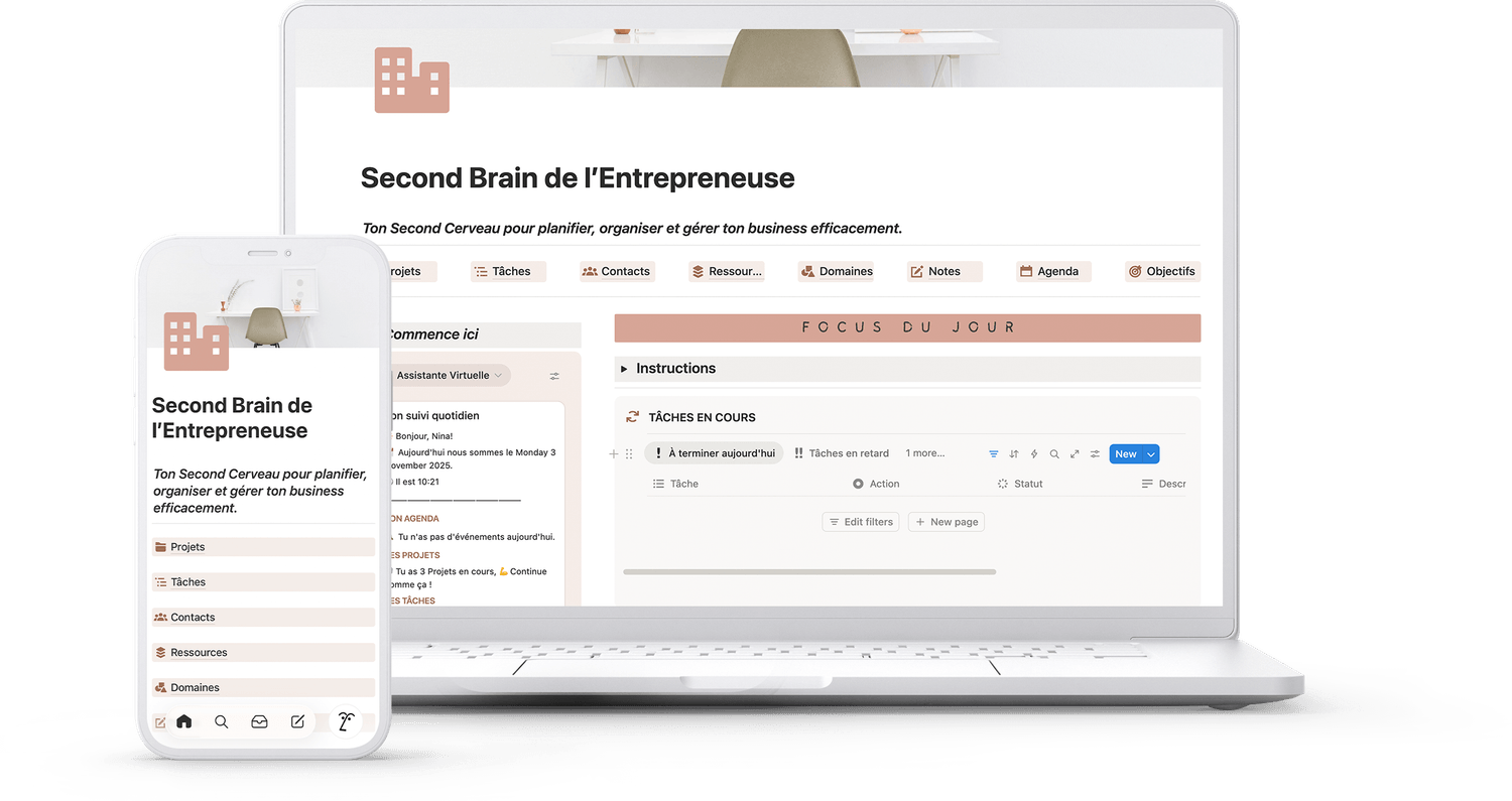 Le template Notion Second Brain de l’Entrepreneuse centralise tes projets, tâches et objectifs dans un seul dashboard clair. Vois tout d'un coup d'œil, avance sans stress, pilote ton business comme une vraie pro.